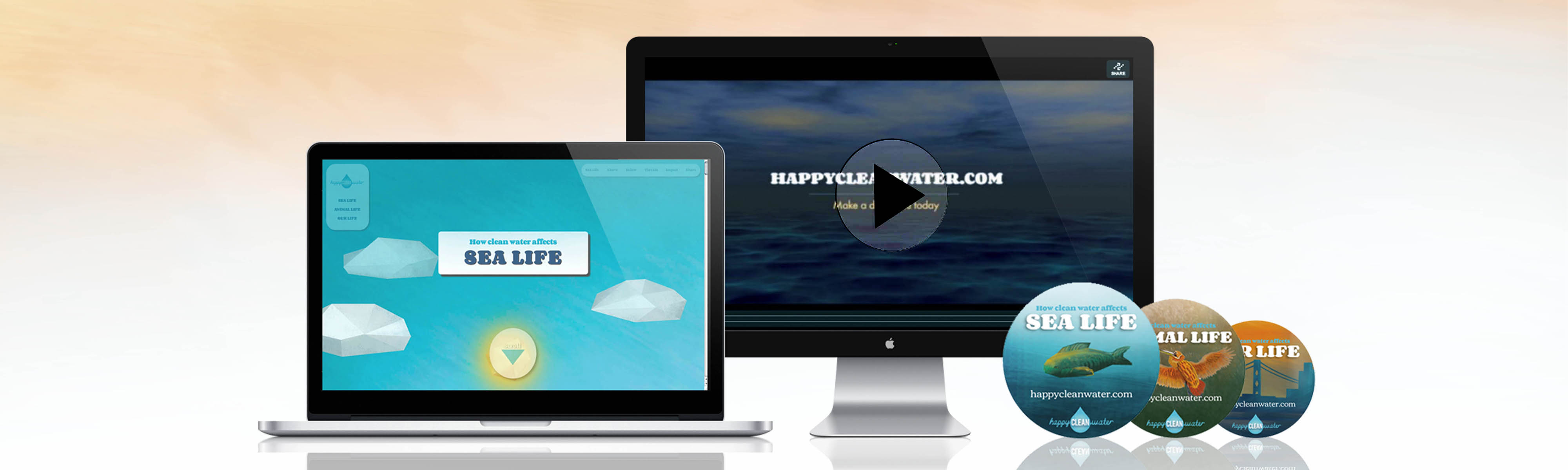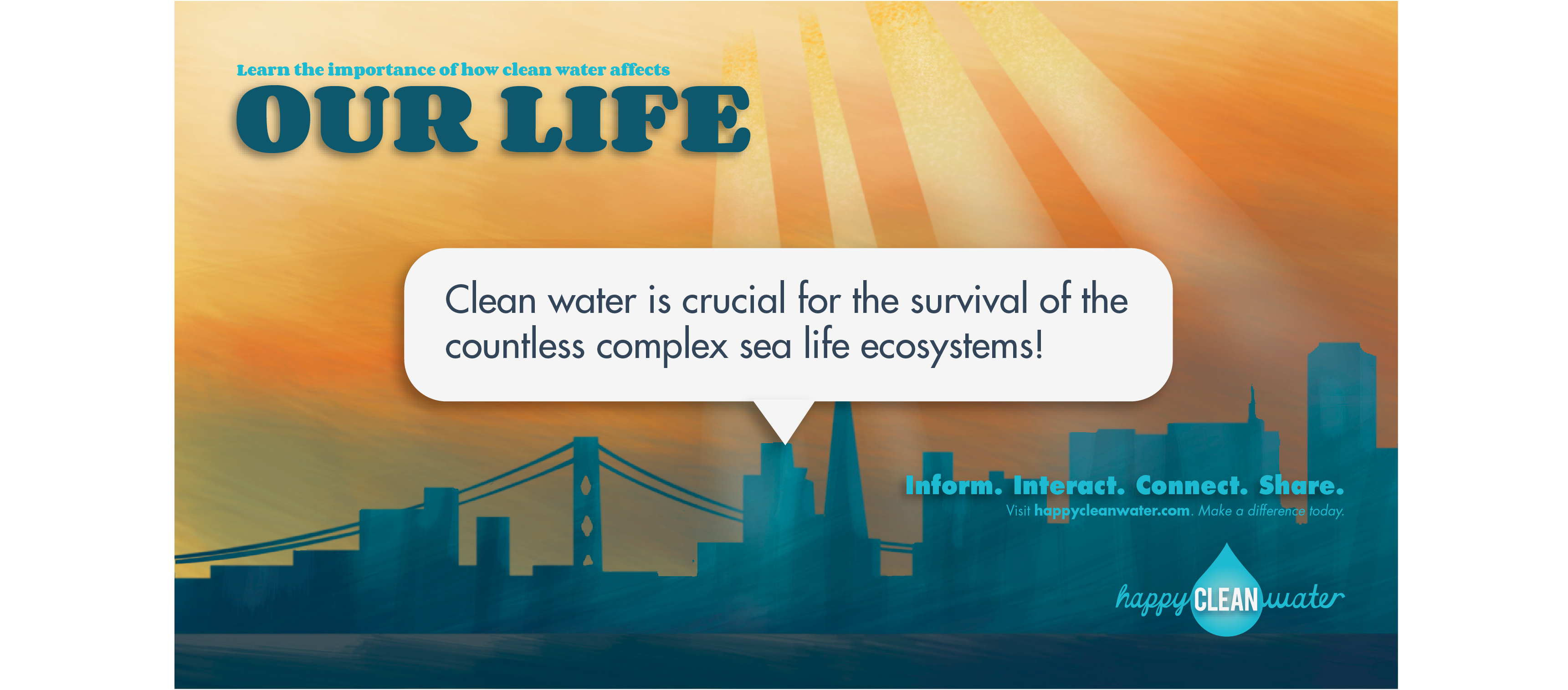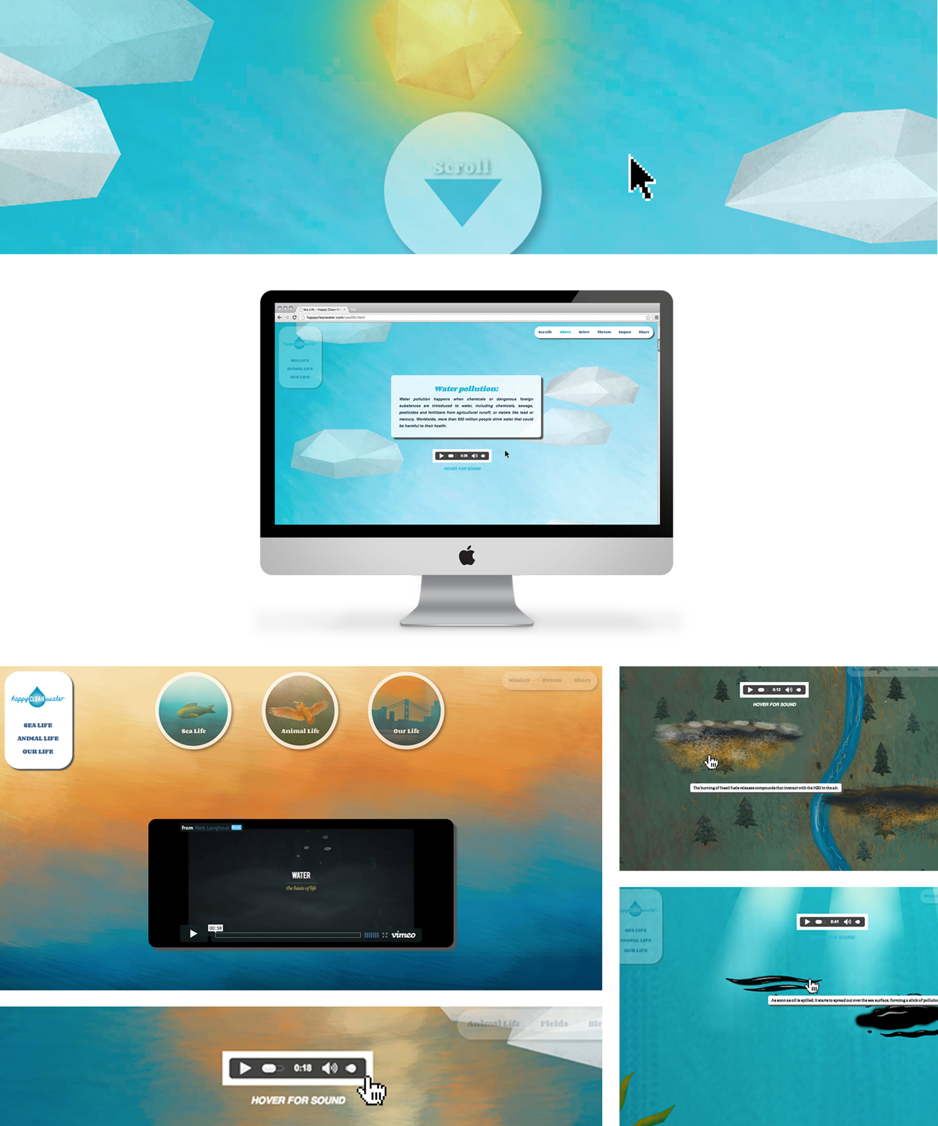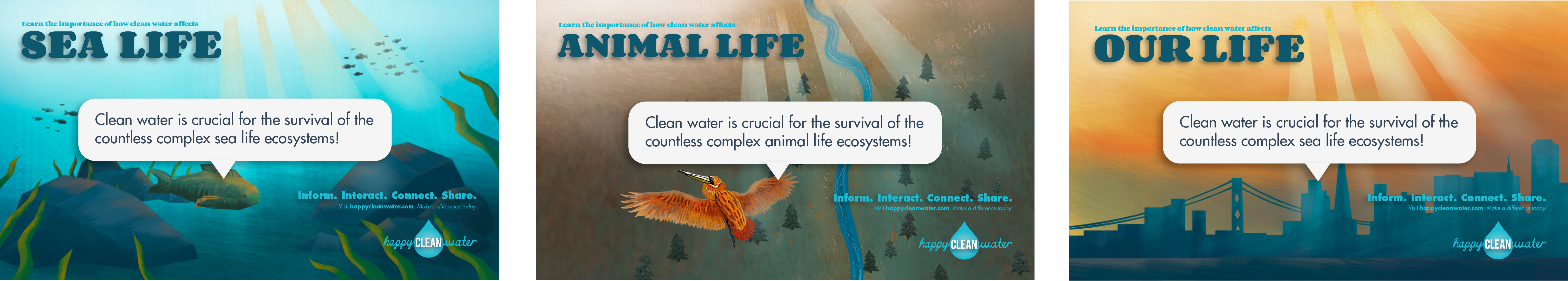 Happy Clean Water is an environmental social campaign focused on keeping water clean; benefitting sea life, animal life, and our lives. Through the organization's online presence, Happy Clean Water captures viewers with informational interaction and engaging motion. It gives viewers the chance to make a difference by sharing the campaign, spreading information, and connecting to resources.